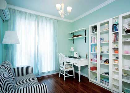 書房作為工作、閱讀、學習的空間,其設計以功能性為主。在其裝修中必須考慮安靜、采光充足、有利于集中注意力,為達到此效果可以使用色彩、照明、飾物等不同方式來營造。