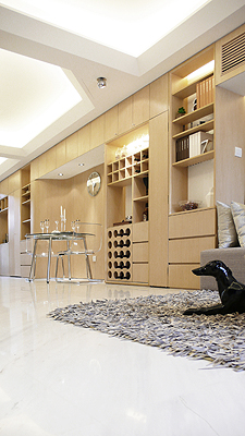 泓鑒裝飾設計這樣的室內設計概念能夠將原本零散的功能部件整合成一個較統一的形體,讓空間氛圍顯得更加整體,擴大視覺感并讓戶型更加有特點。與功能墻向對的另一面墻體則更偏向展示功能。為各個房間所設計的展架及矮柜能夠讓用戶隨意擺設各類型的搜藏品及展示品,并讓戶型空間成為體現住戶個性及品味的宅體。