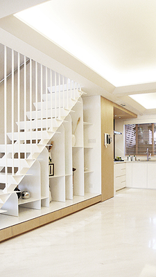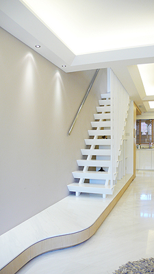 一樓至二樓的單跑階梯為輕質的鋼結構樓梯,設計上盡量簡潔并讓它感覺輕盈通透。鋼板踏步轉折至樓梯下方,將原本沒有功能的異性空間改造成造型感較強的展示空間。