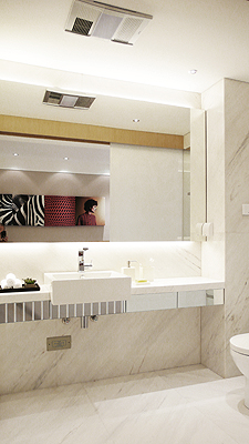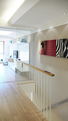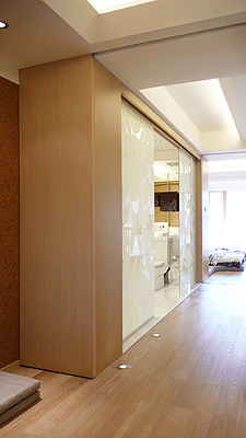 二樓衛生間與過道的分隔墻采用白色的不透明夾膠玻璃,玻璃表面印制花紋。這樣的處理方式不但能夠節省空間,并能夠賦予原本較平淡的過渡空間更多的設計感。玻璃移門能夠左右移開,讓衛生間與過道成為一個整體空間,增加戶型更加通透及開放的生活特性;