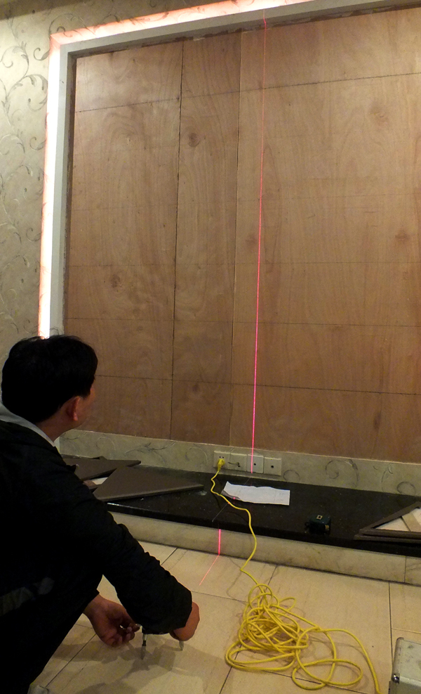 3、吊直、套方、找規矩、彈線:根據設計圖紙要求,把該房間需要軟包墻面的裝飾尺寸、造型等通過吊直、套方、找規矩、彈線等工序,把實際設計的尺寸與造型落實到墻面上。